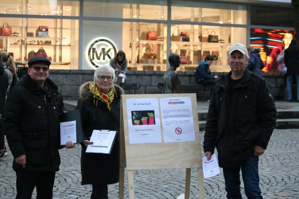 Stavanger Stopp NATO på stand. Fra venstre: Dagbjørn Skipnes, Margaret Sanner og Steinar Eraker. Foto: Henrik Hjelle